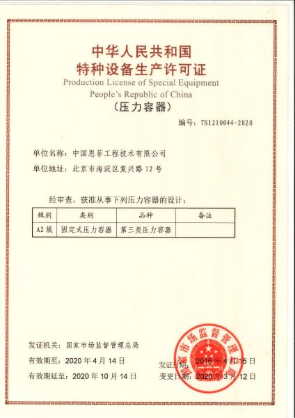 中華人民共和國特種設備生產許可證(壓力容器)