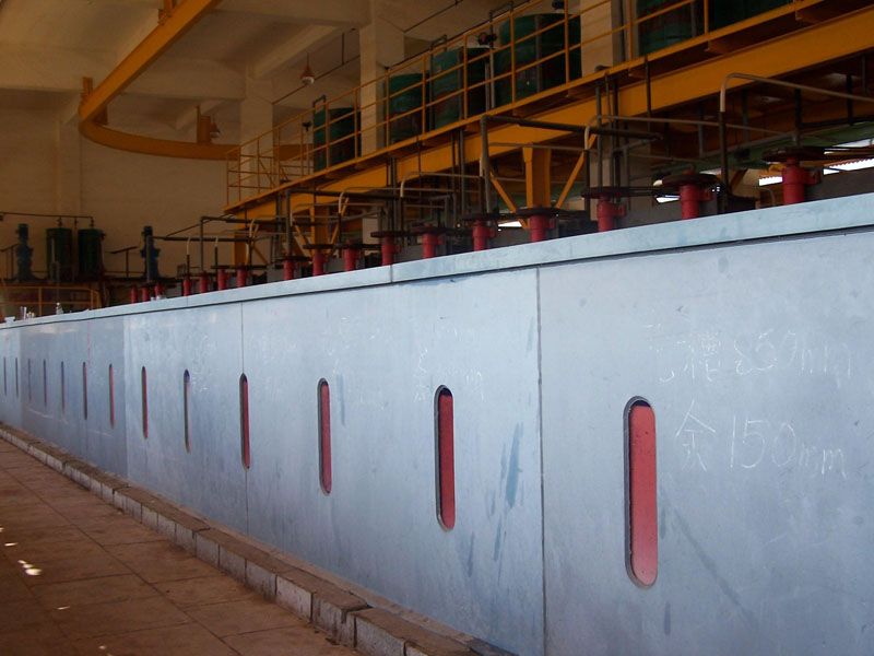 在萃取設備上,多數使用混合澄清式萃取箱(包括淺池和深池式),個別項目用過離心萃取器,如金川3萬噸加壓浸出項目;在萃取箱材質上,可選擇PVC板、FRP、鋼襯FRP、砼襯FRP、不銹鋼等,各材質萃取箱中國恩菲均涉及,且投入使用;在萃取箱規格上,恩菲所設計的,小至混合室尺寸150X150mm,大至直徑2000m,在鎳鈷精煉項目均已投產使用。